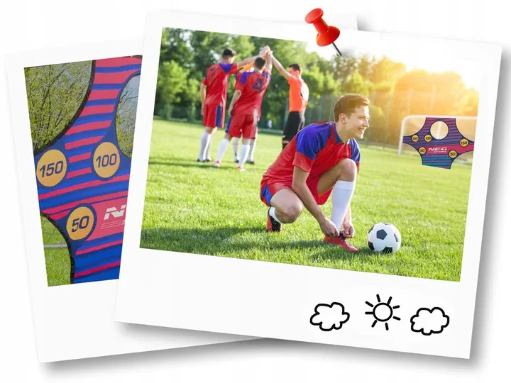 W zestawie z bramką znajduje się mata celownicza, na której znajdują się otwory do strzałów piłką.