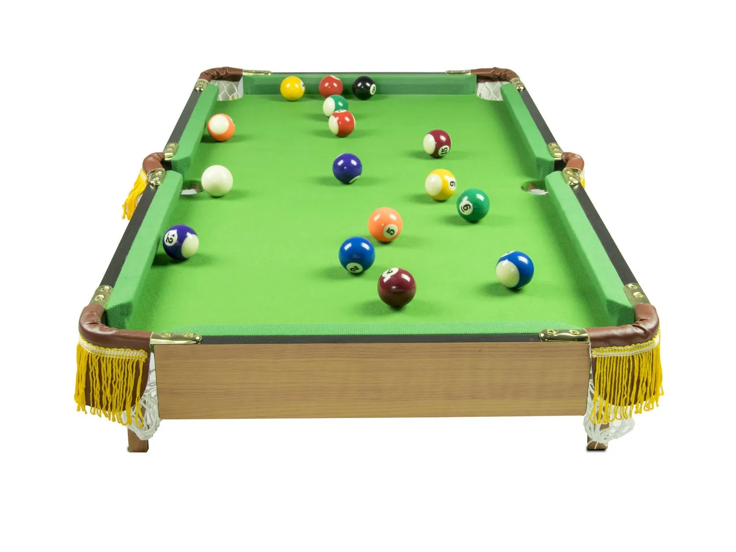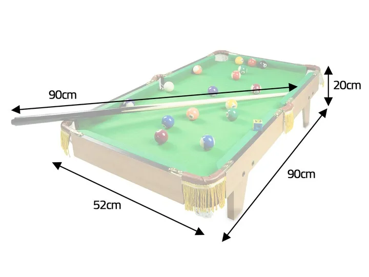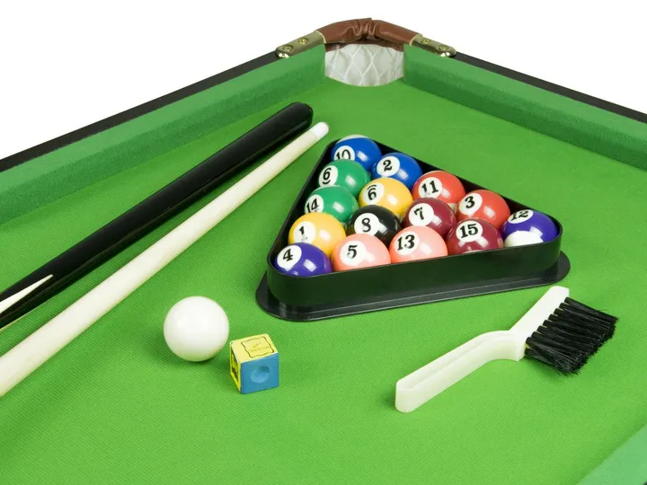 Zestaw zawiera również wszystkie niezbędne akcesoria: 2 kije, 16 bil, trójkąt, szczotkę do czyszczenia sukna oraz kredę bilardową.